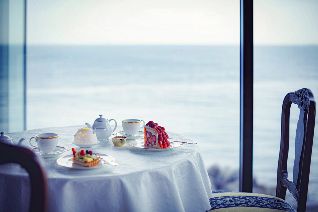 サイフォンで丁寧に淹れる香り高い珈琲と、 宝石のようなズコットケーキやクラシックプリン。 アンティークに囲まれた空間で、海を眺めながら過ごす午後のひととき。 食後にも、カフェタイムにも、心ほどける時間をお楽しみください。